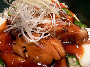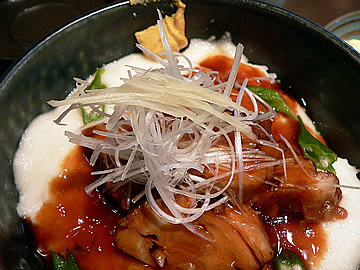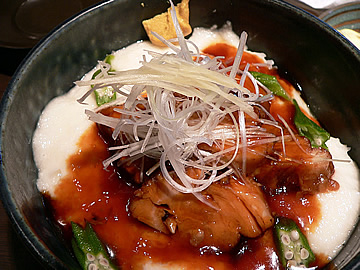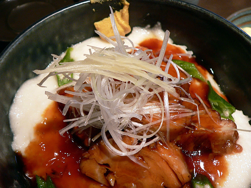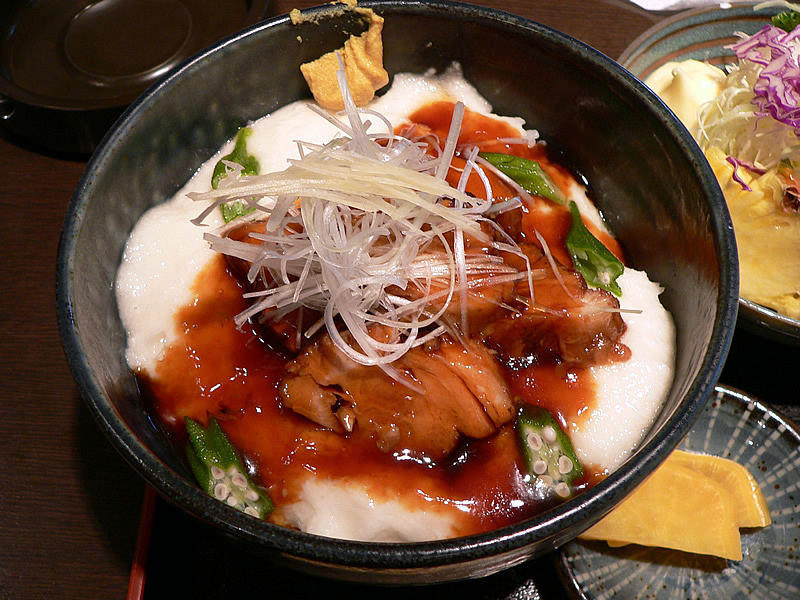 | 川西産長芋の上に柔らかい豚の角煮が乗っていて、角煮の甘いタレがかかっています。 | 角煮を少しほぐして、とろろと絡めながらご飯と一緒に口の中に入れると、美味しさが広がります。 | |