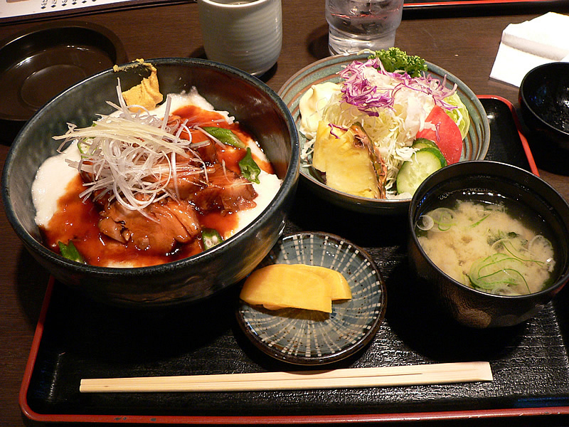 | 豚丼でも紹介した事のある音更町ハピオにある海鮮「蔵」。ここにも「とんとろろ丼」がメニューにあります。じっくり煮込んだ豚の角煮と川西産長芋のハーモニー。サラダ、味噌汁が付いて1050円です。