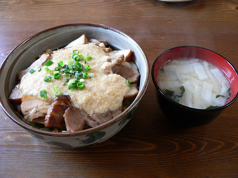 | お昼限定とんとろろ丼800円。味噌汁つき。 | ここのとんとろろ丼はとろろに味付けがされていて、角煮の上にかかっています。 | |