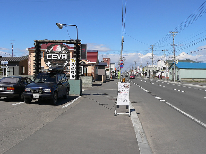 帯広市大正町の市街地にあるレストランセバ。写真の丸い看板が目印です。国道236沿いにあります。写真の道路が国道で、手前が中札内、奥が帯広方向です。