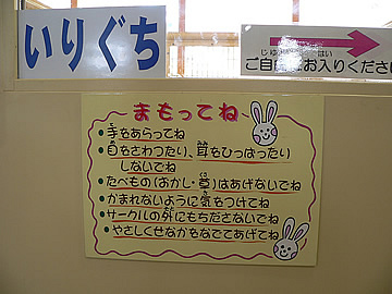 | 中の様子。手洗い場が二箇所あります。動物のいる所に入るには、この中を通っていきます。 | 注意書き。 |