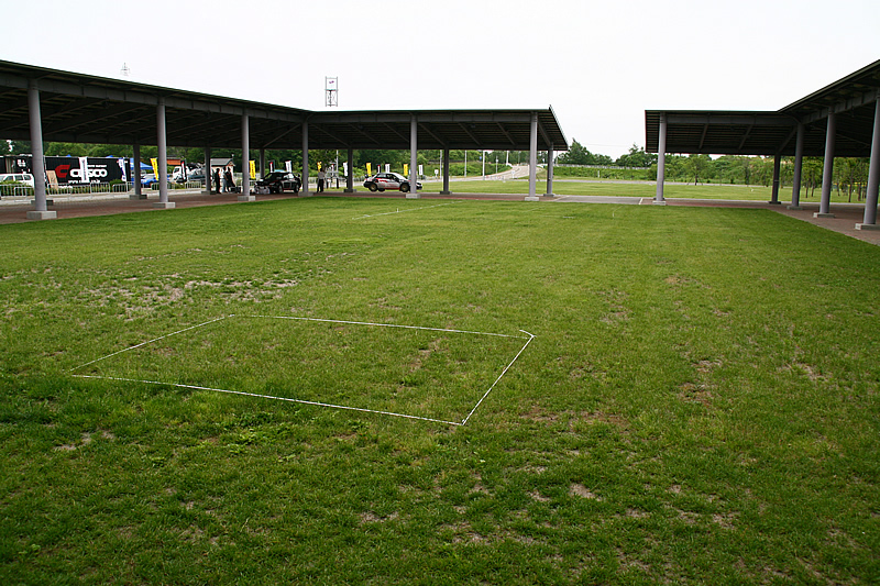 セレモニアルフィニッシュ予定の場所。既に白いロープで線引きされていました。手前の白い四角はメディア用の台が組まれる場所と思われます。いつも最後の方は暗くて見づらくなるので、出来れば照明を沢山用意してほしいです。また、芝の保護の対策がされるのか心配です。